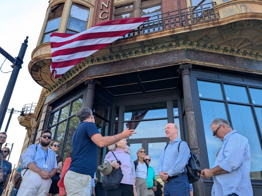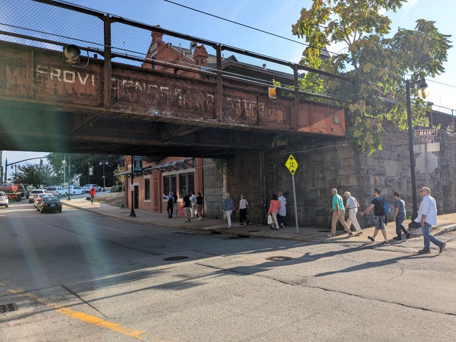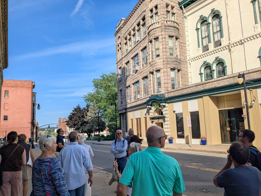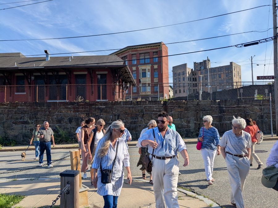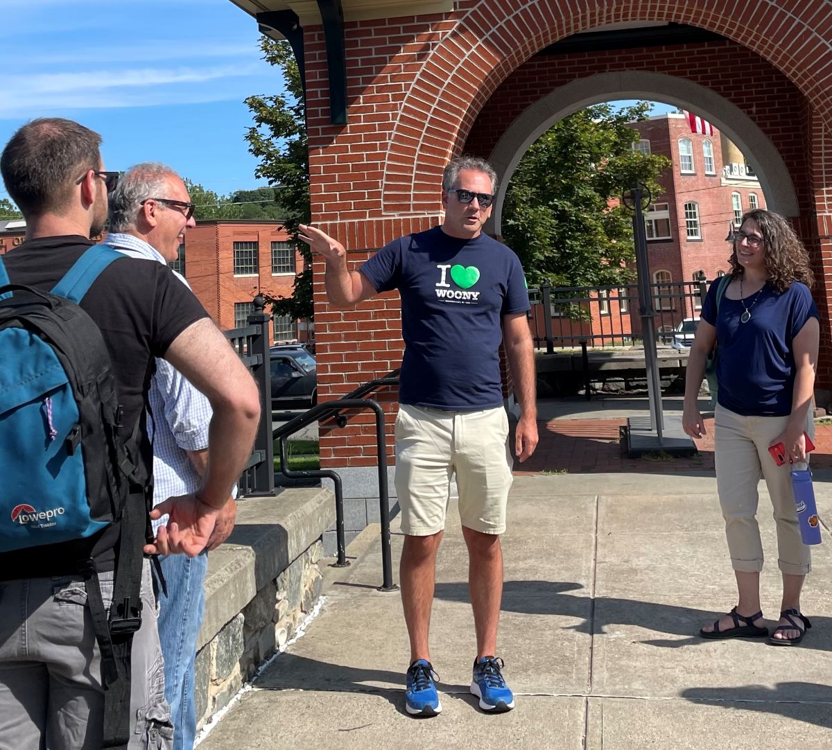 Garrett Mancieri, chair of the Downtown Woonsocket Collaborative, leads a walking tour of his city