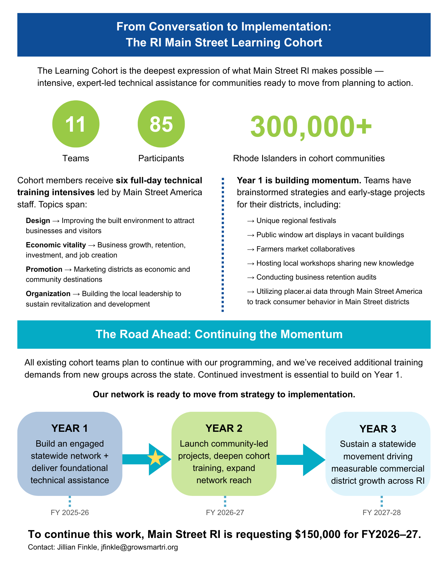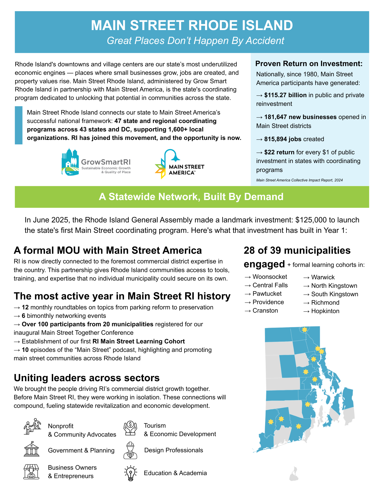 Main Street Rhode Island is seeking $150,000 from the state to continue technical assistance trainings and public programming into FY2027. We have two bills submitted, S 2676 and H 8316, that will go in front of the House and Senate Finance Committees in mid-April (likely around April 16th). The hearings are typically scheduled only 48 hours in advance, so we want to start preparing now!