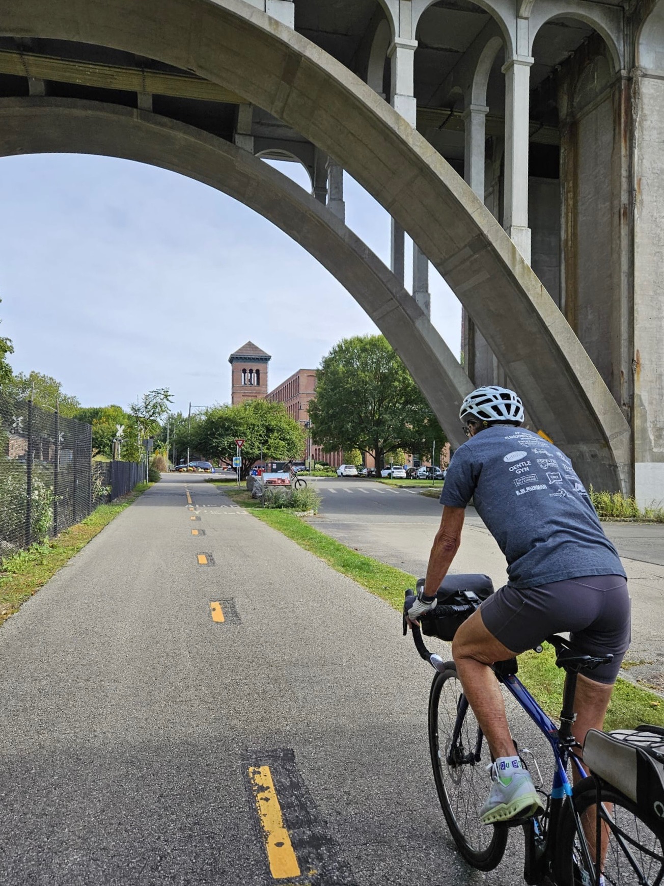 Biking under the Route 116 Viaduct. Photo courtesy of Deirdre Bird